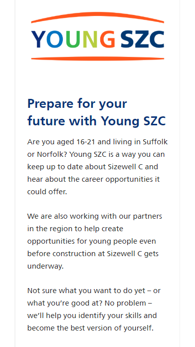 Sizewell C has announced that the project aims to recruit 1,500 apprentices, offering an excellent career path for students. Sizewell C will deliver a range of opportunities from conventional to degree level apprenticeships, these opportunities will be offered if construction of the new nuclear power station goes ahead.   Young Sizewell C and a future Jobs Service will be used to identify as many opportunities as possible for young people living in the east of England.